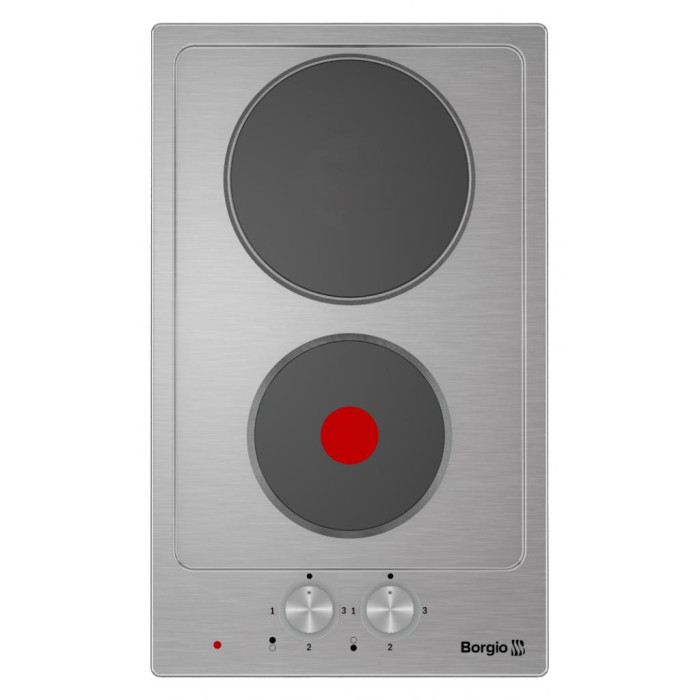 Панель выполнена из практичной нержавеющей стали. Она устойчива к механическим повреждениям и легко отчищается от грязи или пролитых жидкостей. Варочная панель оснащена двумя электрическими чугунными конфорками разной мощности. Электрическая конфорка, помеченная красным кругом является конфоркой быстрого нагрева с повышенной мощностью. Управление осуществляется с помощью механических поворотных переключателей путем установки той или иной конфорки в один из трёх режимов работы. Borgio 3620 Inox имеет ширину 30 сантиметров, вы сможете установить ее в любом удобном для вас месте.