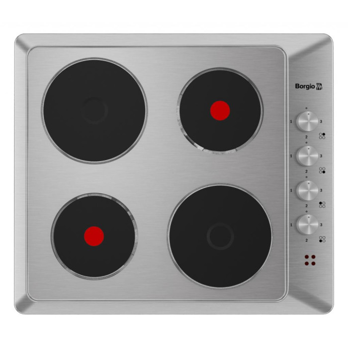 Данная электрическая модель, оснащена 4-мя чугунными дисками, два из которых обычного, а два повышенной мощности для быстрого нагрева. Конфорки с быстрым нагревом обозначены красными кругами на плоскости чугунного диска. Панель управления расположена сбоку, справа. Нагрев конфорок регулируется путём выставления положения ручки в один из трёх возможных режимов мощности. Borgio 6850 Inox выполнена из нержавеющей стали, что позволит ей гармонично сочетаться с бытовой техникой, выполненной в такой же гамме. К тому же нержавеющая сталь не боится царапин, долговечный и неприхотливый в уходе материал. Данная варочная поверхность имеет стандартную ширину, поэтому вы сможете установить ее в любом удобном для вас месте.