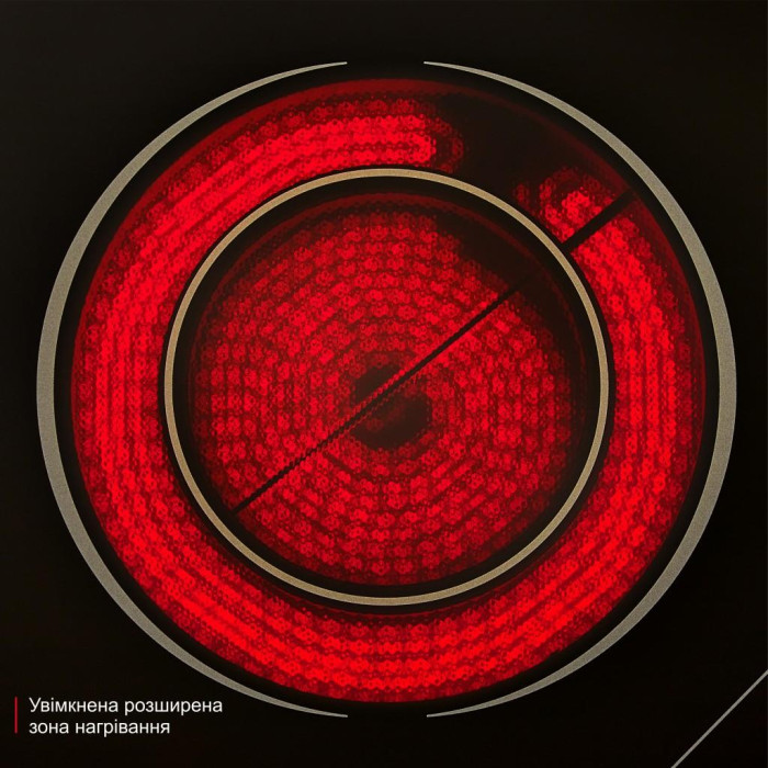 Конфорка состоит из основной зоны меньшего диаметра и дополнительной, большего диаметра. Включение дополнительного контура увеличит мощность зоны более чем в 2 раза и заметно ускорит готовность блюда.