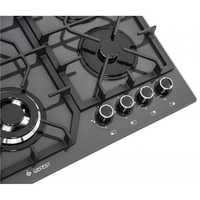 Изделие снабдили четырьмя конфорками с различными диаметрами и силой нагрева. Наличие высокоэффективной турбоконфорки с двойным рядом пламени обеспечивает максимально быстрый и качественный результат готовки, к тому же, данная горелка лучше всего подходит для сковороды типа «вок». Классическое расположение конфорок привычно и удобно многим, и позволяет наиболее рационально распределить посуду на плите.