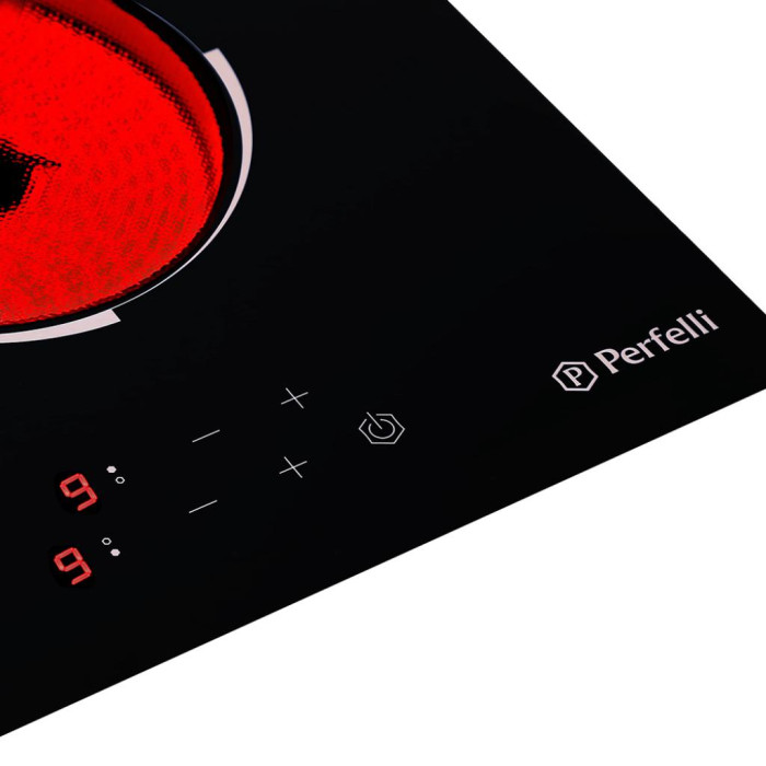 На передней панели находиться дисплей, на нем высвечивается задействованная зона нагрева и уровень мощности, а также можно производить уменьшение/увеличение мощности нагрева. Электрические две конфорки обладают разной мощность нагрева: большая зона имеет нагрев в 1.8 кВт, а малая зона поддерживает нагрев в 1,2 кВт. Благодаря этому, вы сможете оптимально распределять нагрев во время процесса приготовления. Для безопасности установлен «замок от детей», при его включении на дисплее высвечивается соответствующая индикация. PERFELLI VH 3101 BL также имеется индикация безопасности нагрева.
