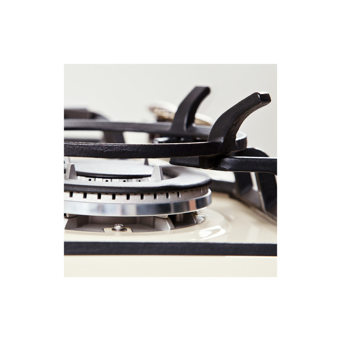Они имеют множество преимуществ по сравнению с эмалированными решетками, поскольку намного устойчивее к повышению температуры, выдерживают более тяжелые кастрюли, к тому же их намного легче передвигать по такой поверхности. Несомненно, чугунные решетки придают варочной поверхности современный и стильный вид, а в сочетании с нежной панелью цвета слоновой кости отлично впишутся в интерьер Вашей кухни. Представленная модель имеет в наличии особую турбоконфорку, которая при поджиге создает тройной ряд пламени