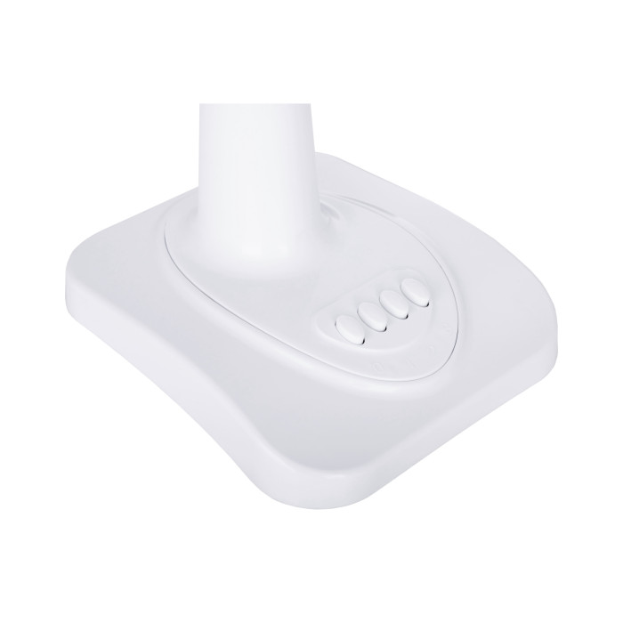 Белый пластик корпуса удачно контрастирует с темной окраской лопастей вентилятора, что выглядит особенно стильно при вращении лопастей. Четыре кнопки, расположенные в нижней части корпуса вентилятора, позволяют легко и удобно выбирать одну из трех скоростей работы вентилятора. Функция вращения значительно увеличивает эффективность работы вентилятора, позволяя донести свежий воздух в самые отдаленные уголки комнаты.