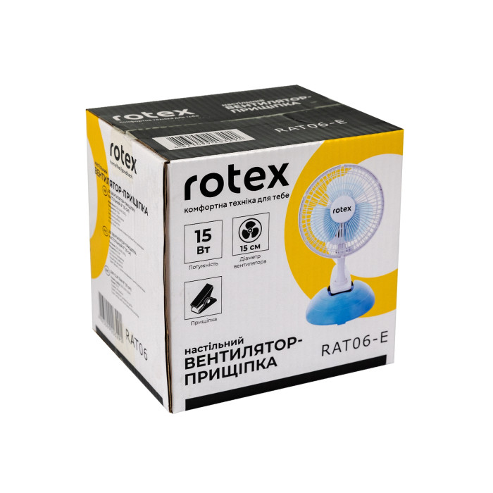 Rotex RAT06-E – компактный вентилятор, который используется локально в комнате, где вы работаете или спите. В глобальных масштабах он не спасает от жары, но дарит небольшую прохладу ненадолго. Мощность устройства составляет 15 Вт. Лопасти имеют размер в диаметре по 15 см каждая из трех. Лопасти защищены пластиковой сеткой, для того чтобы не пораниться или не сломать устройство.