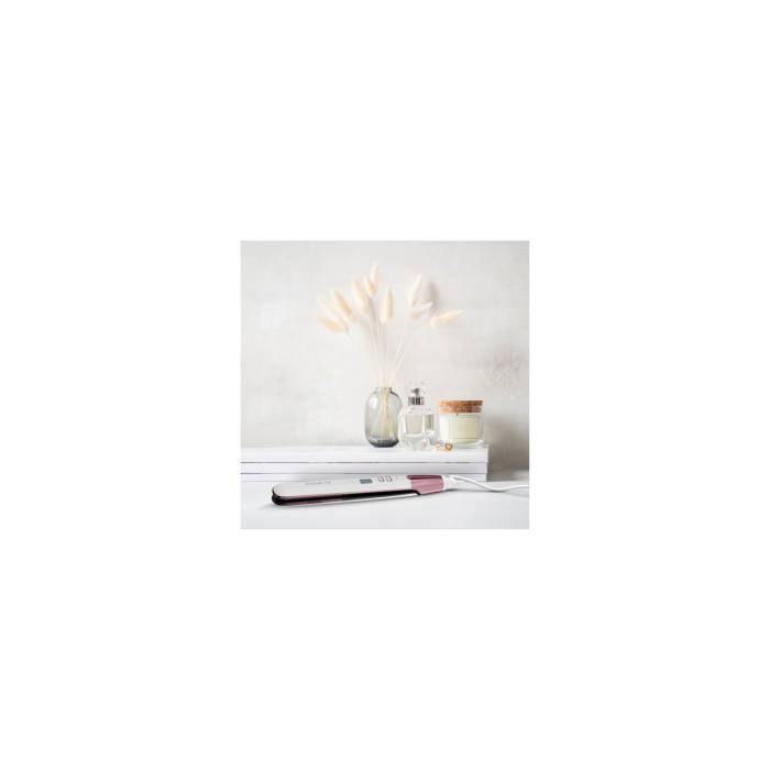Покрытие Quartz Rose Ceramic в сочетании с ионным эффектом, уменьшающим статическое электричество, делает ваши волосы гладкими и сияющими, добавляя до 41 % больше блеска.* *% в среднем, независимое лабораторное исследование, по сравнению с натуральными волосами, Франция, 2021 г.