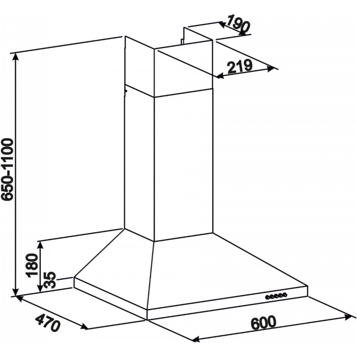 Каминная пристенная вытяжка, режим работы отвод, производительность 650 куб.м/ч, 3 скорости, кнопочное управление, освещение светодиодная лампа, алюминиевый жировой фильтр, ширина 60 см.