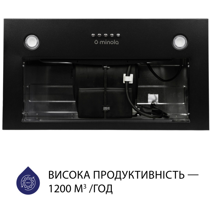 Полновстраиваемая кухонная вытяжка Minola HBI 58270 BL 1200 LED оборудована одним мотором высокой мощностью 200 Вт. Максимальная производительность устройства в режиме отвода воздуха составляет 1200 м3/час. Это позволяет эффективно удалять испарения, нежелательные запахи и копоть, которые образуются в процессе приготовления пищи.
