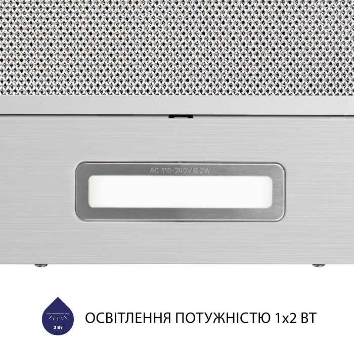 Кухонная вытяжка оборудована LED-лампой мощностью 2 Вт. Светодиоды обеспечивают комфортное дополнительное освещение варочной поверхности, являясь при этом наиболее экономным источником света.