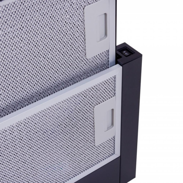 В основе вытяжки мотор, имеющий достаточно высокую мощность – 230 Вт. Такой рабочий потенциал способен обеспечить работу на 2 скоростях. При этом максимальная продуктивность работы равна 1100 м3/ч. С таким ресурсом можно обслужить комнату большой площади, сделав воздух чистым в мгновение ока. Механические кнопочные переключатели Механическое управление устройством основано на кнопочных переключателях, которые можно фиксировать в нескольких положениях. Располагается такая кнопка сбоку. На ней имеются условные обозначения функционала, разобраться в которых совсем несложно.