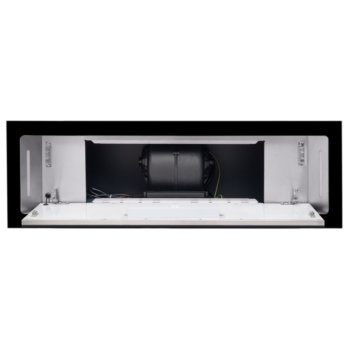 Фасадная часть вытяжки декорирована черным закаленным стеклом. Этот материал обладает отличными визуальными качествами, высокой износостойкостью, устойчивостью к высоким температурам и механическим повреждениям.