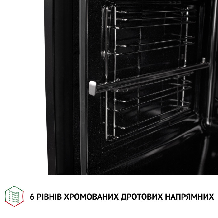 Съемные направляющие из хромированной стали позволяют обеспечить легкий доступ к блюдам и их удобное размещение. Телескопические направляющие позволяют удобно и безопасно доставать блюдо из раскаленной камеры и ставить его внутрь, избегая ожогов. Они расположены на 6 уровнях, которые позволяют обеспечить равномерный нагрев блюда и размещать посуду разного размера и формы.