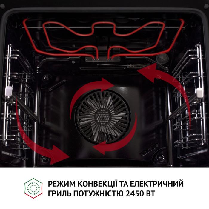 LED-white дисплей, расположенный по центру панели, обеспечивает удобный и интуитивно понятный доступ к функциям духовки и отображение необходимых настроек.