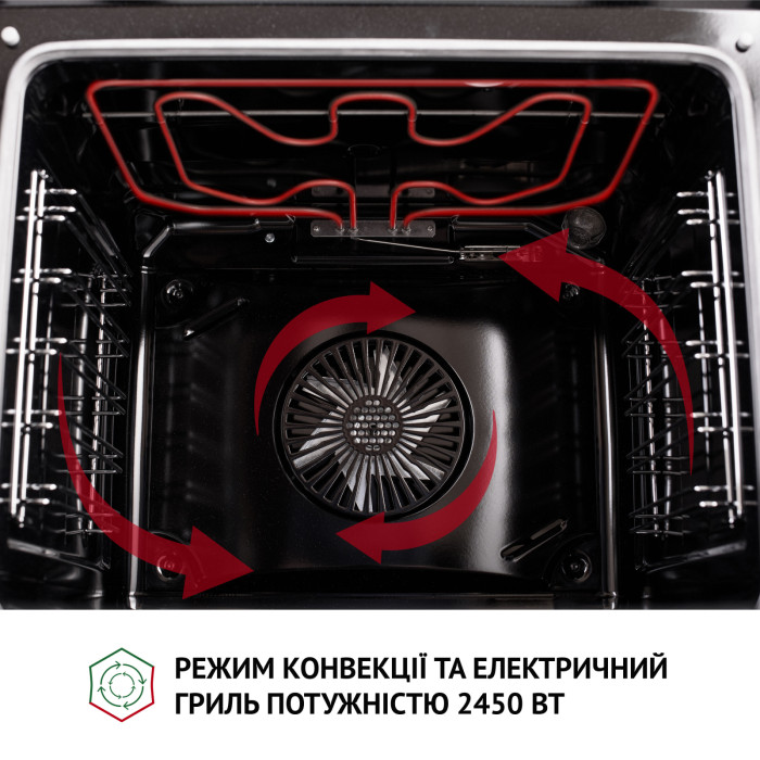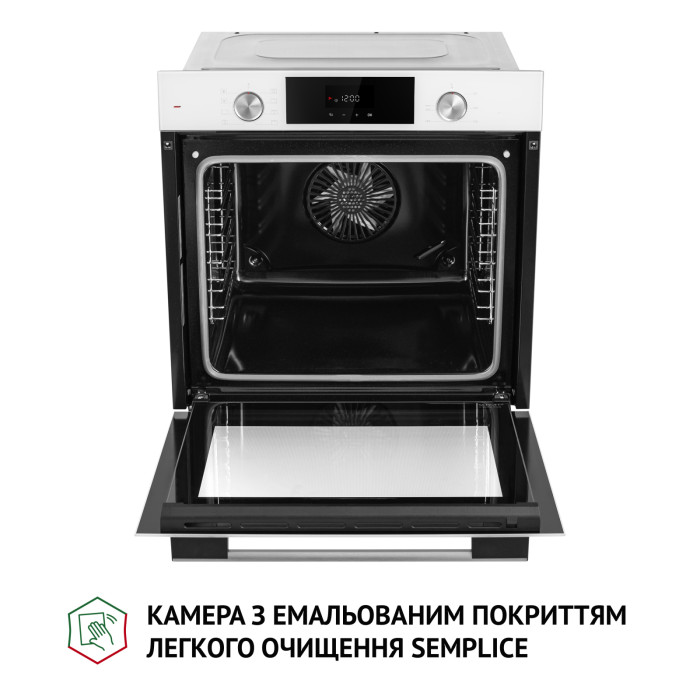 LED-white дисплей, расположенный по центру панели, обеспечивает удобный и интуитивно понятный доступ к функциям духовки и отображение необходимых настроек.