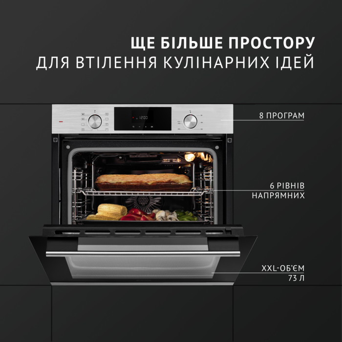 Духовой шкаф с большой камерой объемом 73 литра позволяет готовить большие порции пищи или несколько блюд одновременно, обеспечивая при этом равномерный и быстрый нагрев благодаря эффективной термоизоляции. Такая емкость идеально подходит для приготовления разнообразных блюд, от запеканок и пиццы до больших кусков мяса и птицы, что позволяет готовить для большого количества людей и экономить время.