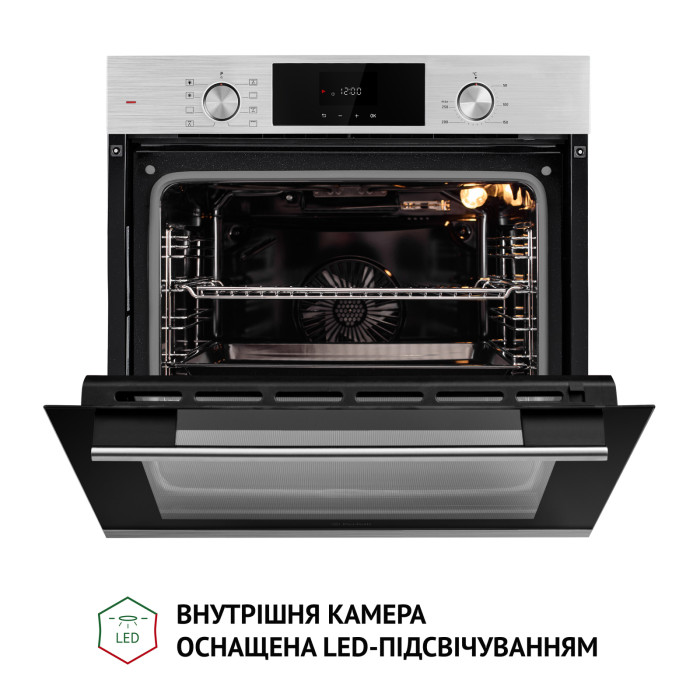 LED-white дисплей, расположенный по центру панели, обеспечивает удобный и интуитивно понятный доступ к функциям духовки и отображение необходимых настроек.
