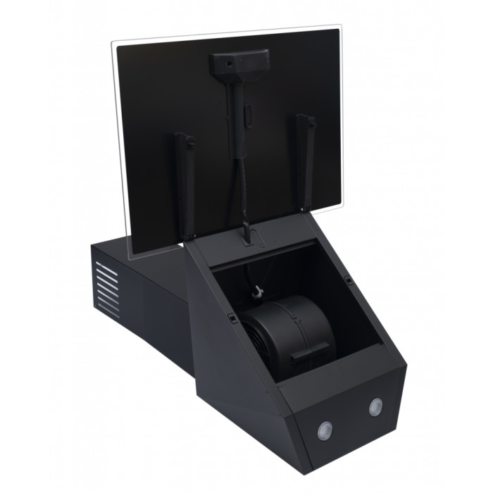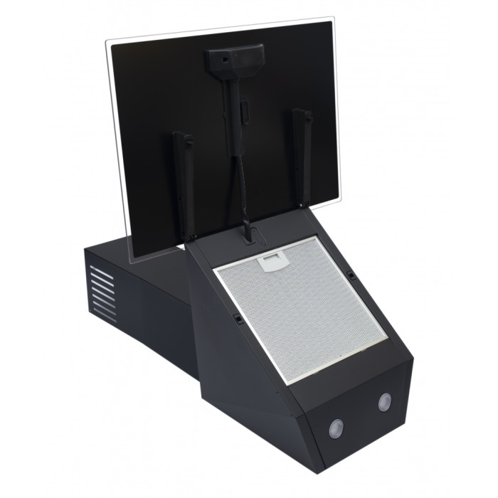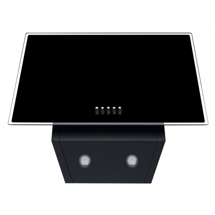 Лицевая часть вытяжки выполнена из закаленного стекла и декорирована прозрачным ободком.