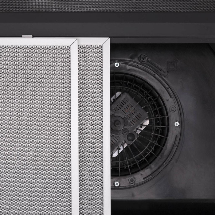 В режиме отвода воздух, проходя через металлический жироулавливающий фильтр, очищается от жира и удаляется из кухни в вентиляционный канал. В режиме рециркуляции через угольный фильтр воздух очищается от запаха, и затем снова возвращается в помещение кухни. PYRAMIDA MH 10-50 black
