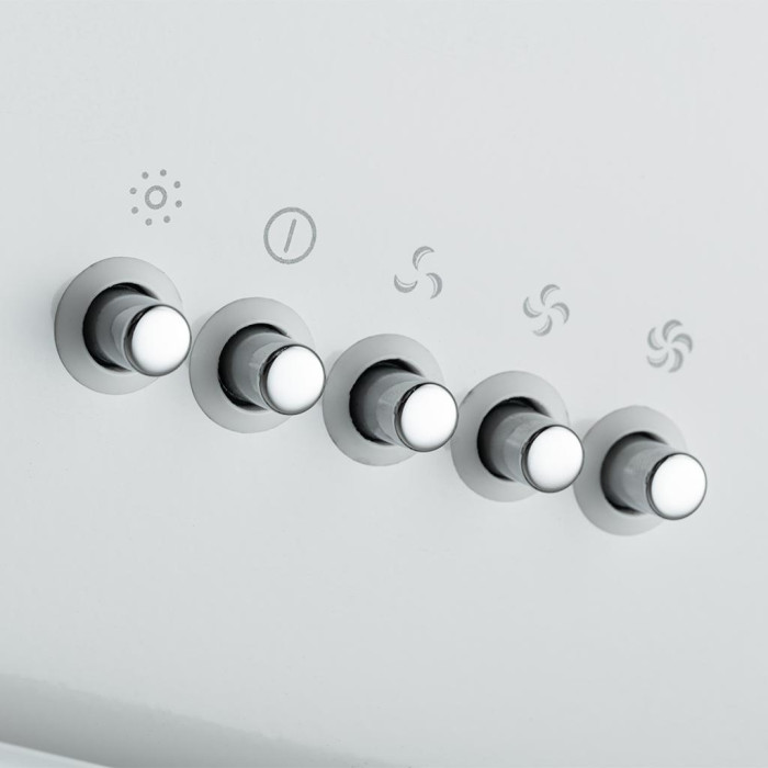 Управление вытяжкой осуществляется за счет механических элементов взаимодействия. Блок, состоящий из пяти кнопок, расположен в нижней части фронтальной панели устройства. Около каждой из них имеется обозначение функций, выполненное в виде стандартных пиктограмм. Отключить и включить устройство, активировать освещение, выбрать необходимую интенсивность втягивания воздуха – все это сделать достаточно легко и просто.