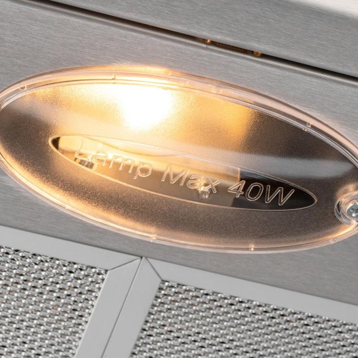 Pyramida UX 50 имеет мощный мотор на 172 Вт. Он надежно зашищен от проникновения жира и пыли жироулавливающим фильтром, который состоит из 5 уровней защиты. Такой фильтр легко снимается для очистки, его также можно мыть в посудомоечной машине. Вытяжка имеет три скорости, переключаются все параметры с помощью удобной панели управления. Устройство работает исключительно на рециркуляцию воздуха.
