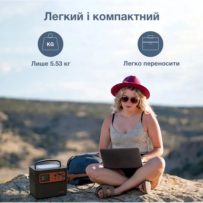 Tig Fox T50 оборудована розетками переменного тока 220-230 В, снабжена портами USB (поддержка быстрой зарядки), светодиодными фонарями и LCD-дисплеем, может заряжаться от электросети, авто и солнечных панелей, является компактной и сверхлегкой (всего 5,53 кг).