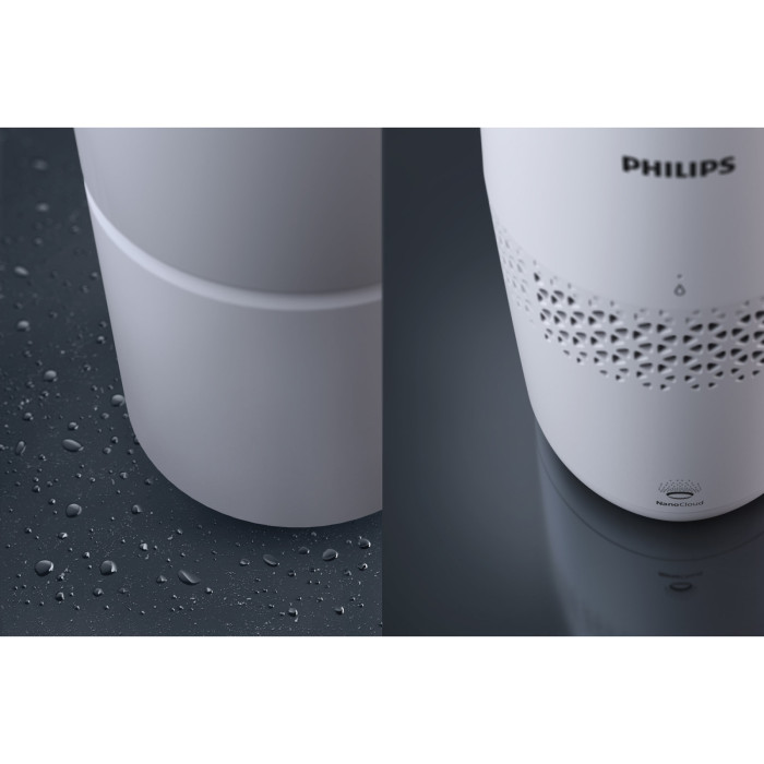 Невидимые молекулы, выделяемые увлажнителем с технологией NanoCloud, не приводят к образованию белого налета и влажных пятен в комнате. Более крупные капли могут намочить окружающие предметы и переносить минералы, оставляющие белый налет на соседних поверхностях. Частицы, выделяемые увлажнителем с технологией NanoCloud, слишком маленькие, поэтому не могут переносить минералы, что эффективно предотвращает образование налета и пятен.