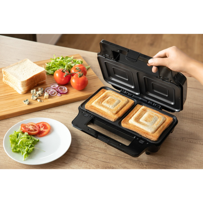 Готуйте сендвічі, смажте м'ясо або випікайте вафлі: 4 змінних дека 285 x 152 мм (сендвіч трикутної форми, паніні, 2 дуже глибоких для вафель і сендвічів квадратної форми)