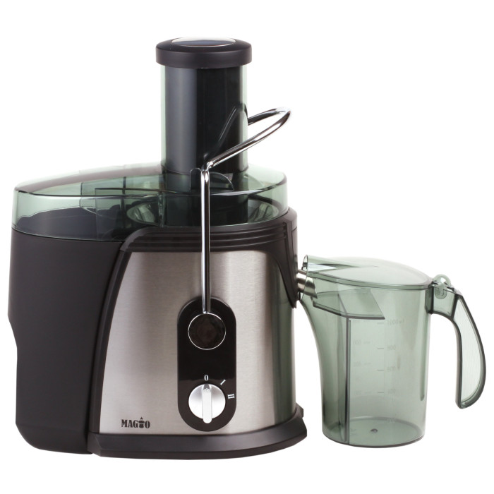 Magio MG-190 - це універсальна соковижималка, яка дозволить готувати сік практично з будь-яких овочів і фруктів. Пристрій має велику потужність і відповідно швидкість обертів, тобто соковижималка здатна вичавлювати з продукту максимум при мінімальних витратах часу. Ви зможете зробити сік з будь-якого овоча або фрукта, будь то апельсин, персик, виноград або тверда морква без проблем. Вона має два режими швидкості і зможе працювати з твердими і м'якими продуктами. Механічне управління невибагливо в експлуатації і не боїться перепадів напруги.