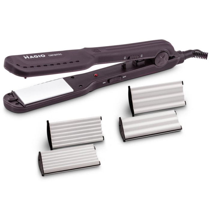 У комплект входить три знімні панелі для випрямлення, великих і маленьких хвиль, які професійно і дбайливо забезпечать чудову укладку. Завдяки скороченню кількості рухів під час випрямлення волосся укладання буде займати менше часу. Випрямляч оснащений спеціальним фіксатором, який розташований в підставі приладу. Він фіксує пластини, забезпечуючи зручність зберігання випрямляча і захист від пошкоджень.