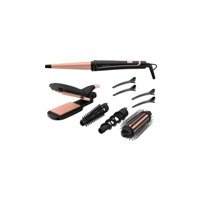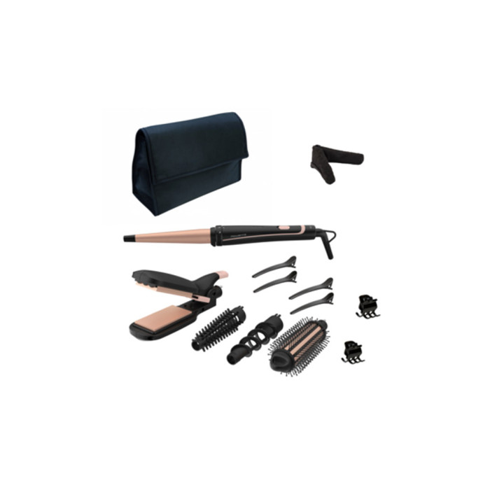 Мультистайлер працює як випрямляч 2 в 1 з системою Smart Switch і щипцями гофре, кругла щітка з нагріванням діаметром 32 мм і конічні щипці для завивки і оснащений комплектом додаткових аксесуарів: насадкою для створення спіральних локонів, щіткою для додання обсягу, сумкою для зберігання та іншими. Керамічне покриття насадок знімає статичну електрику і розгладжує пухнасте волосся, роблячи його слухняними і блискучим. Спеціальний термоізольований накінечник захищає від випадкових опіків і гарантує повну безпеку під час використання пристрою.
