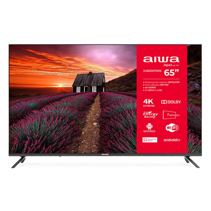 Aiwa JU65DS700S - смарт телевізор з величезним, 65 дюймовим екраном, операційною системою Android 9.0, потужним 4х ядерним процесором, функцією Chromecast (передача контенту на екран) і фірмовим звучанням Aiwa. Модель оснащена Ultra HD super VA матрицею класу А + з роздільною здатністю (3840 × 2160) і володіє супер якісною картинкою в 4К, унікальною технологією HDR та вбудованим USB-медіа плеєром для перегляду фото-відео контенту. Телевізор має ліцензійний GOOGLE TV, широкі можливості підключення та багатий функціонал.