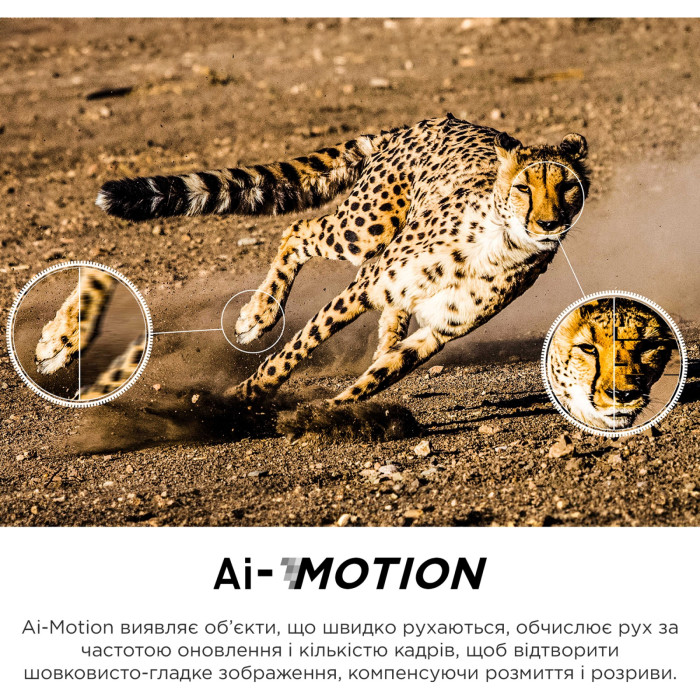Ai-Motion чутливо виявляє об’єкти, що швидко рухаються, обчислює рух за частотою оновлення та кількістю кадрів, щоб відтворити шовковисто-гладке зображення, компенсуючи розмиття та розриви.