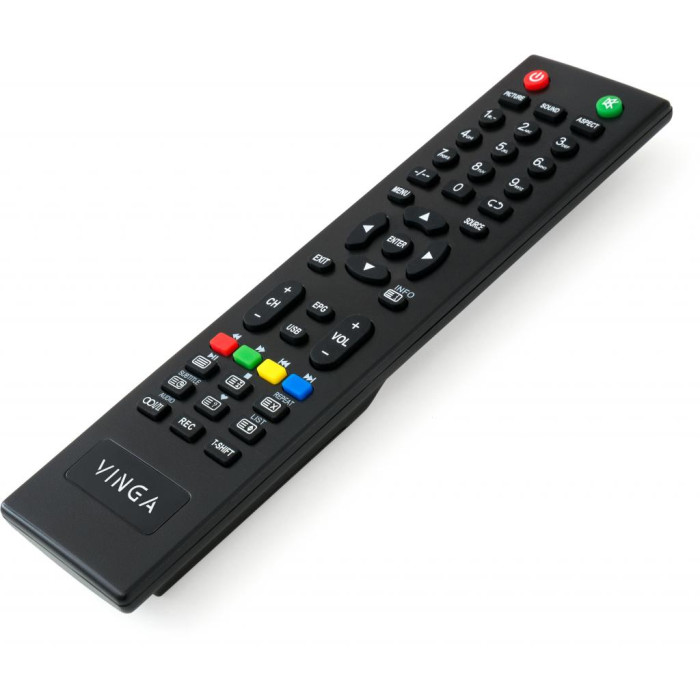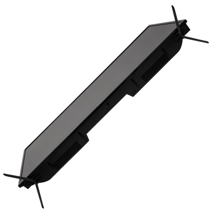 Монтувати пристрій можна і за допомогою системи кронштейнів VESA - вона універсальна і підходить для будь-якої стіни. У наборі разом з телевізором йдуть гвинти для кріплення, ніжки підставки, батарейки для пульта і сам пульт. Пульт, як і телевізор, має матовий темний корпус. Для зручності користування девайсом на задній спинці пульта є спеціальні виїмки для пальців.