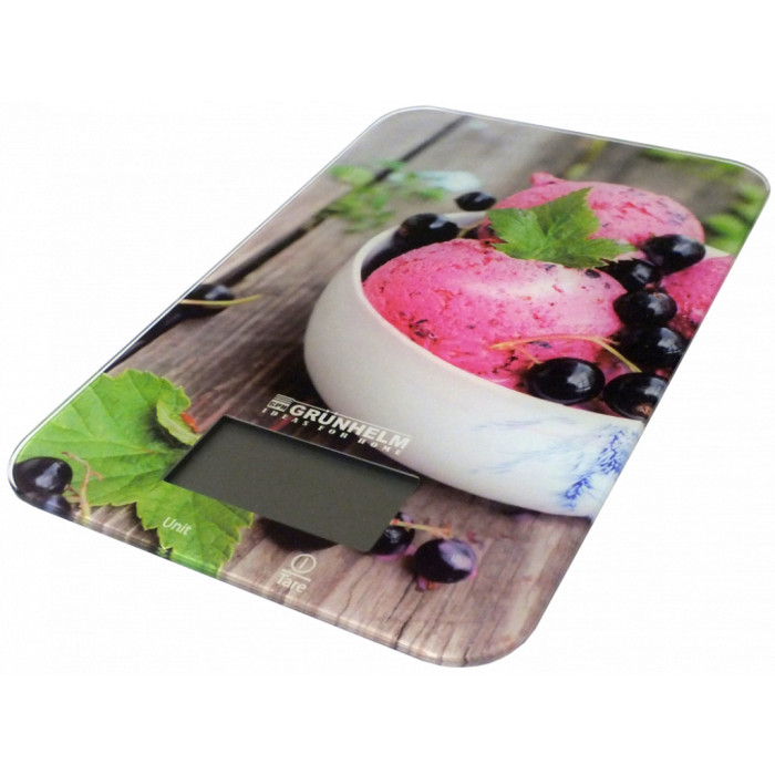 Ваги кухонні Grunhelm KES-1RIC вироблені зі скла. З функціями вирахування тари та автовиключенням. Максимальна вимірювана вага - 5 кг.