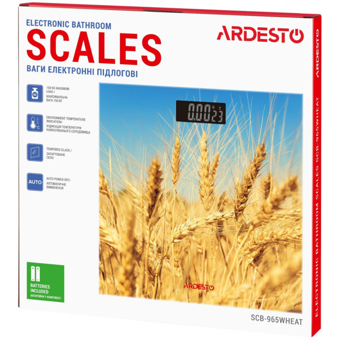 Підлогові ваги з дизайнерським малюнком. Призначені для вимірювання маси тіла та оснащені вбудованим термометром і функцією порівняння попередньої ваги. Модель SCB-965WHEAT виконана в ексклюзивному дизайні. Малюнок с пшеницею надає вагам властивості модного аксесуара для прикраси будь-якого приміщення.