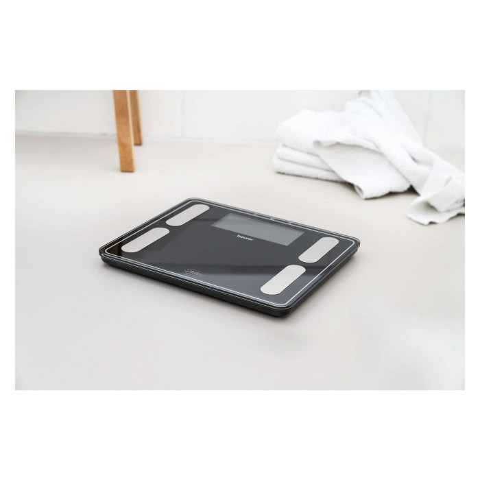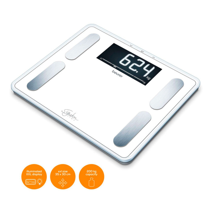 Великі діагностичні ваги Beurer BF 410 зі збільшеною максимальною вагою та інтерпретацією результатів. Визначають вагу тіла, жирну масу, вміст води в організмі, м'язову масу, кісткову масу, визначають обмін речовин і рівень фізичної активності (BMR/AMR), розраховують індекс маси тіла.