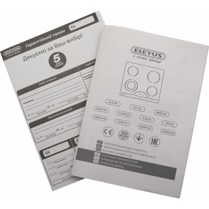 Купити Eleyus GERDA 301 IS H можна за доступною ціною і переконатися в приємному співвідношенні ціни і якості. Нагрівання поверхні має коефіцієнт корисної дії 60 - 70%, в порівнянні з газовими конфорками, цей показник в 2 рази більший. Електрична плита Eleyus GERDA 301 IS H використовує кисень для готування, це дозволяє ефективно використовувати простір кухні.