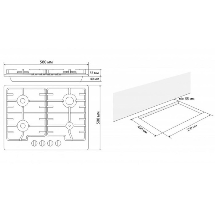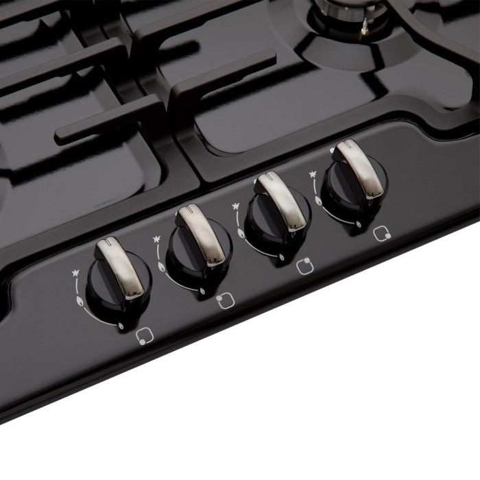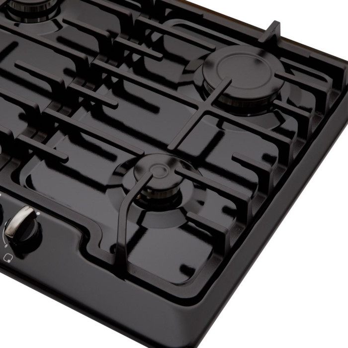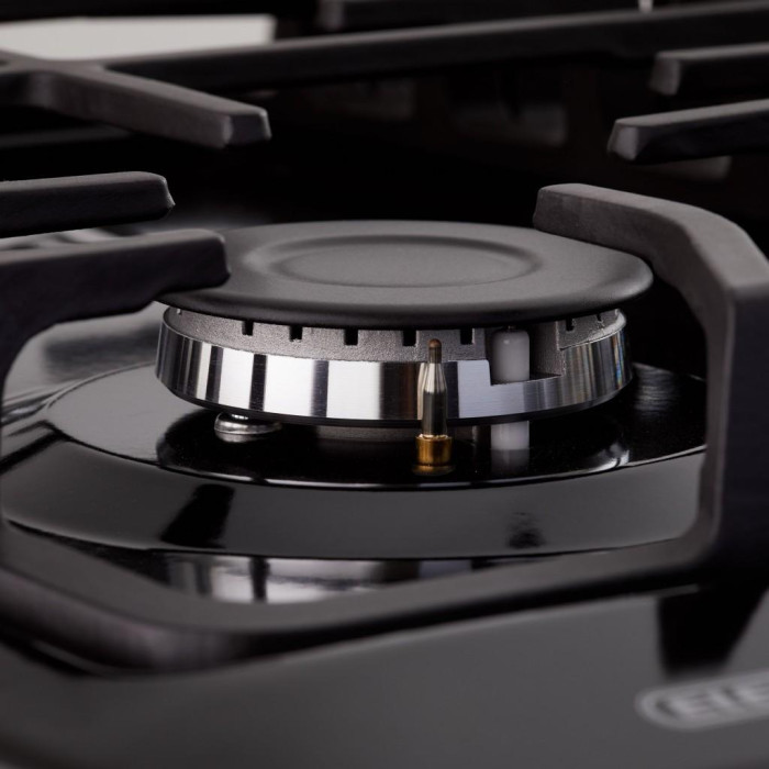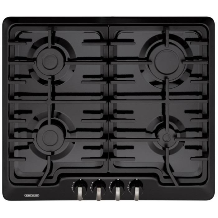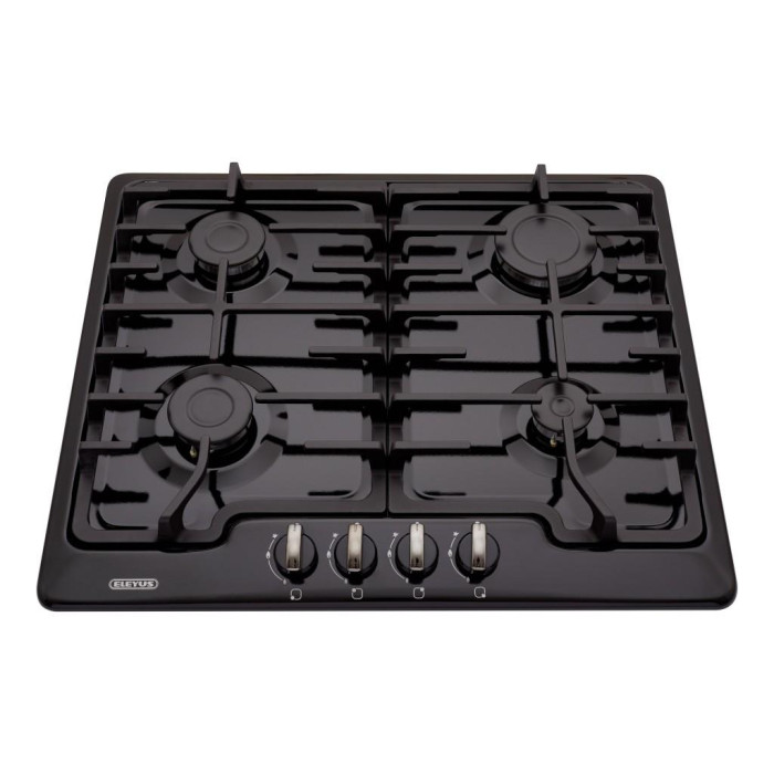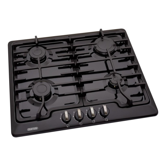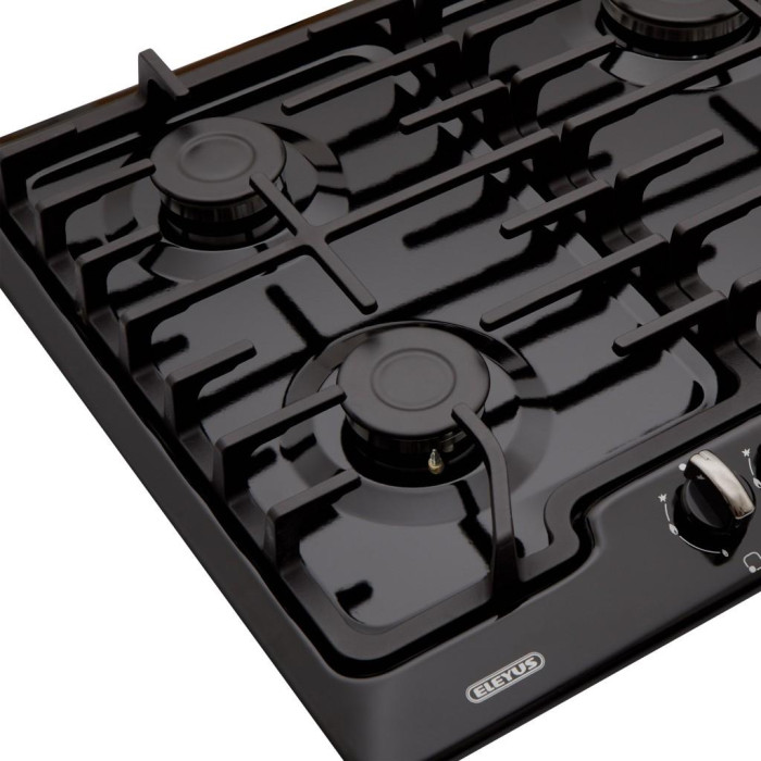 Газова варильна поверхня ELEYUS GRACIA 60 BL CF обладнана чотирма конфорками: однією швидкою (2,5 КВт), двома напівшвидкими (1,7 КВт кожна) та однією допоміжною (0,9 КВт). Варто зауважити, що швидка конфорка розроблена таким чином, що її розташування та потужність убезпечують поверхню стіни від нагрівання. Електрозапалювання із керуванням в ручці робить користування приладом легким та невимушеним.