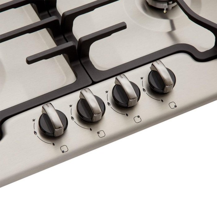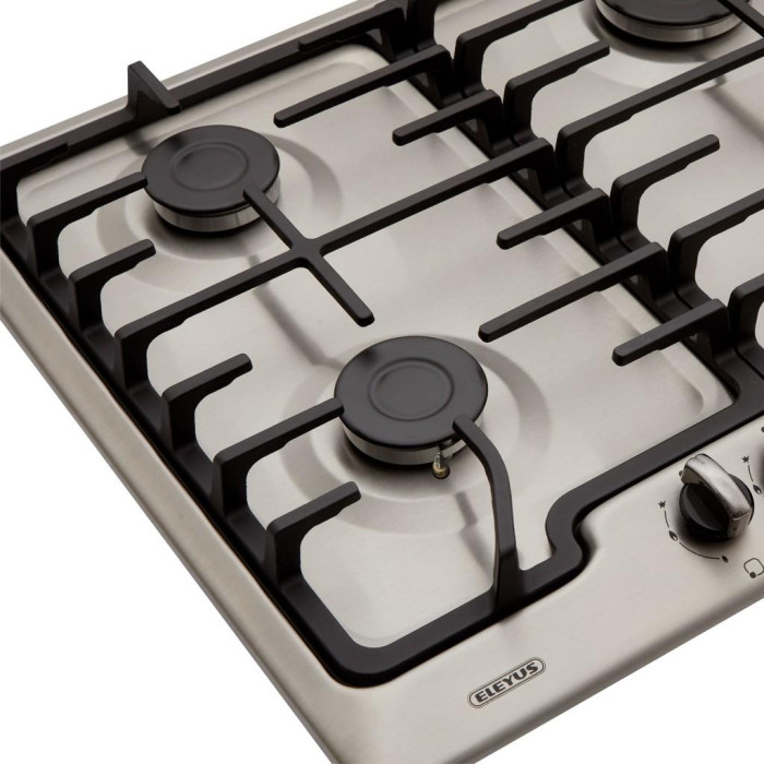 Газова варильна поверхня ELEYUS GRACIA 60 IS CF виконана із харчової нержавіючої сталі марки AISI 304 високої якості, котра не лише має привабливий естетичний вигляд, а й проста у догляді, що точно оцінить кожна господиня. Поверхня обладнана двома чавунними решітками сучасного ергономічного дизайну, котрі є стійкими до прогорання, а отже довговічними.