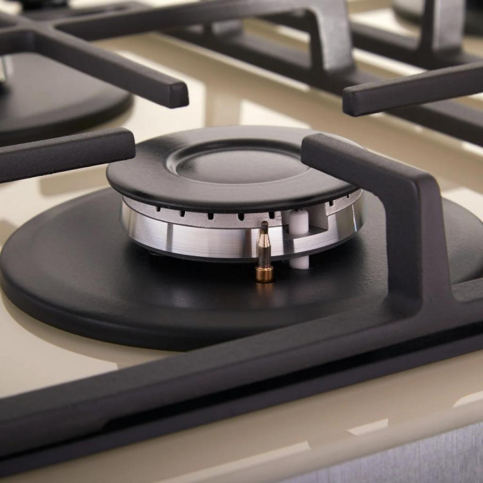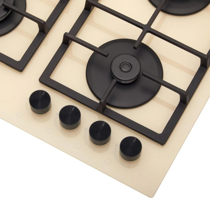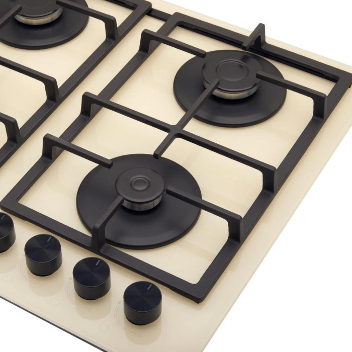 Загартоване скло стає все більш популярним матеріалом для газових варильних поверхонь, адже воно просте в догляді та надзвичайно ефектне. Розміщення пальників дає змогу ефективно використовувати всю робочу поверхню без хвилювань про розташування посуду. Зміщені праворуч поворотні перемикачі розташовані на безпечній відстані від джерела полум'я, щоб ви не обпікалися.