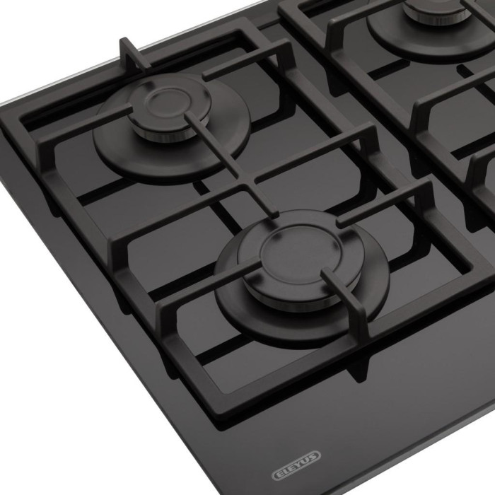 Сучасні газові поверхні ТМ ELEYUS — це гарантія безпеки вашого будинку. Газ-контроль вимикає подавання газу в разі випадкового загасання полум'я. Поверхня обладнана поворотними перемикачами з блокуванням, що унеможливлює випадкове вмикання приладу (для вмикання необхідно натиснути на перемикач і повернути його). Крім того, швидка конфорка розташована спереду ліворуч і частково висунута вперед, що дає використовувати посуд великих розмірів і захищає поверхню стіни від нагрівання Для підтвердження високої якості та безпеки у використанні всі газові варильні поверхні ТМ ELEYUS проходять чотирирівневий контроль герметичності з'єднань газової арматури на різних етапах виробництва.