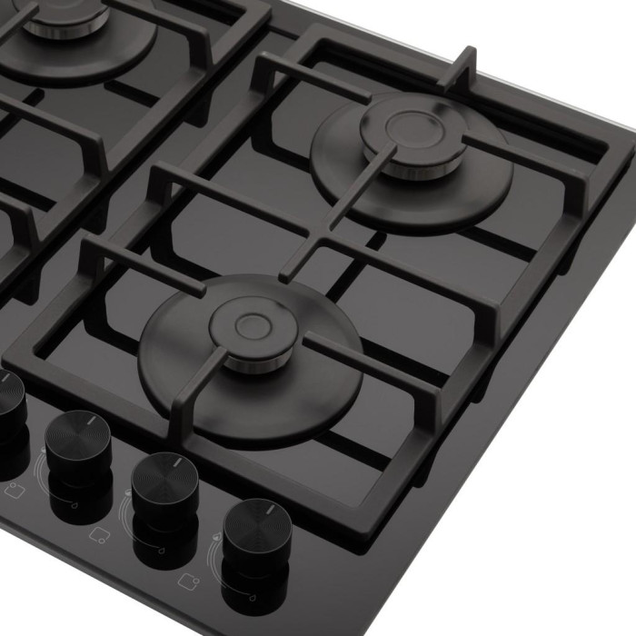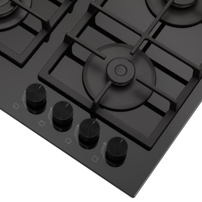 Загартоване скло стає все більш популярним матеріалом для газових варильних поверхонь, адже воно просте в догляді та надзвичайно ефектне. Розміщення пальників дає змогу ефективно використовувати всю робочу поверхню без хвилювань про розташування посуду. Зміщені праворуч поворотні перемикачі розташовані на безпечній відстані від джерела полум'я, щоб ви не обпікалися.