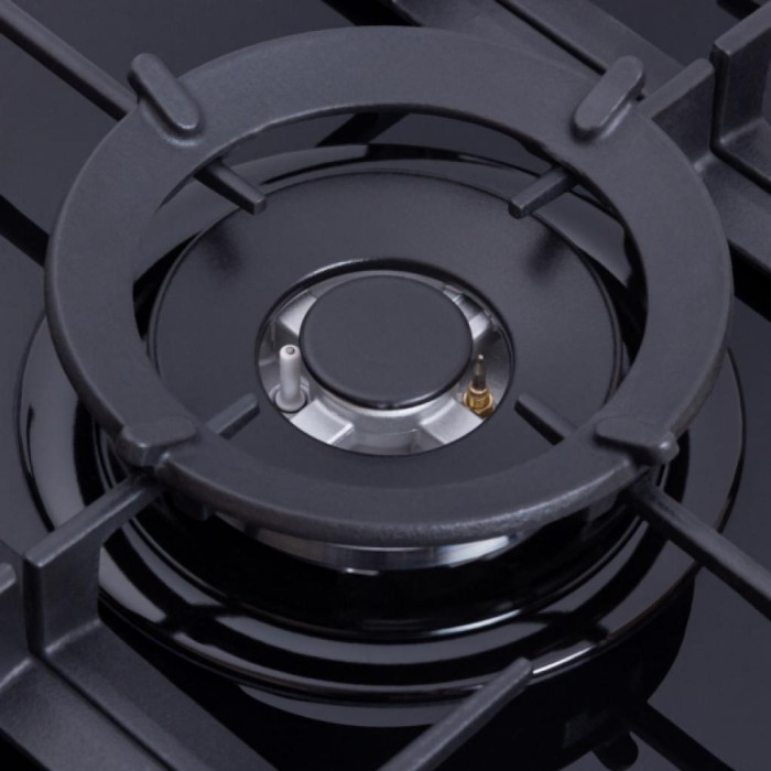 Прилад оснащений функцією електрозапалювання в ручках управління, WOK пальником і перехідником для нього, а також італійськими конфорками SABAF - для вашої зручності в приготуванні страви. Ергономічне розташування пальників забезпечує додатковий комфорт при використанні декількох зон одночасно.