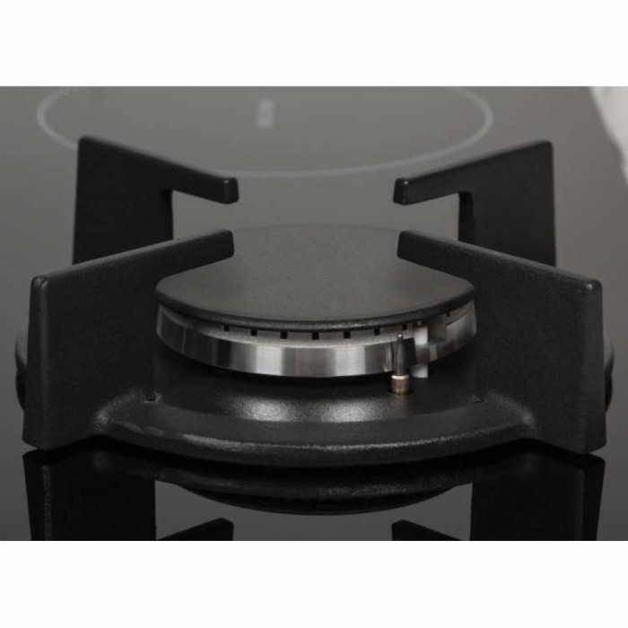Газово-індукційна поверхня не тільки ефективна за рахунок наявності вибору на чому готувати, але і має вельми привабливий дизайн. Чорне скло відмінно підходить під різні варіації кухонь, при цьому ще більшої родзинки техніці надають індукційні зони нагріву, які мають круглу форму та помічені білим кольором.