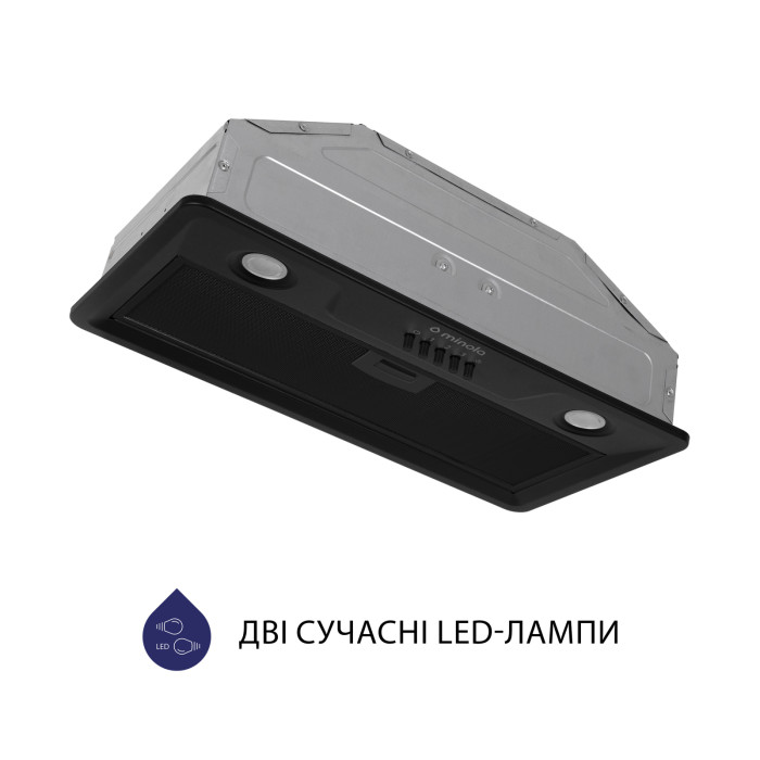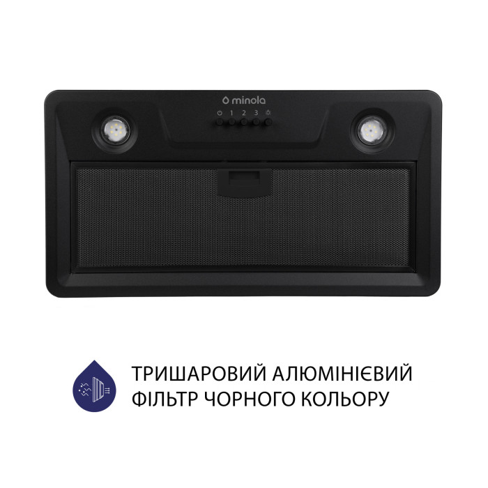 Кухонна витяжка Minola HBI 52022 BL 700 LED обладнана тришаровим жировим алюмінієвим фільтром чорного кольору. Він забезпечує надійний та ефективний захист двигуна та інших деталей витяжки від потрапляння жиру та бруду.