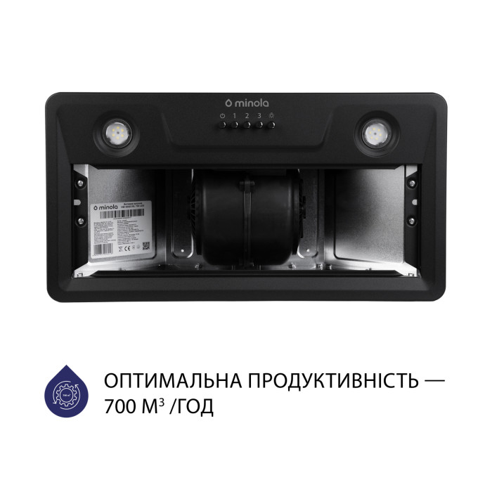Повновбудовувана кухонна витяжка Minola HBI 52022 BL 700 LED обладнана одним двигуном оптимальною потужністю 100 Вт. Максимальна продуктивність пристрою в режимі відведення повітря складає 700 м3/год. Це дозволяє ефективно видаляти випари, небажані запахи та кіптяву, які утворюються в процесі приготування їжі.