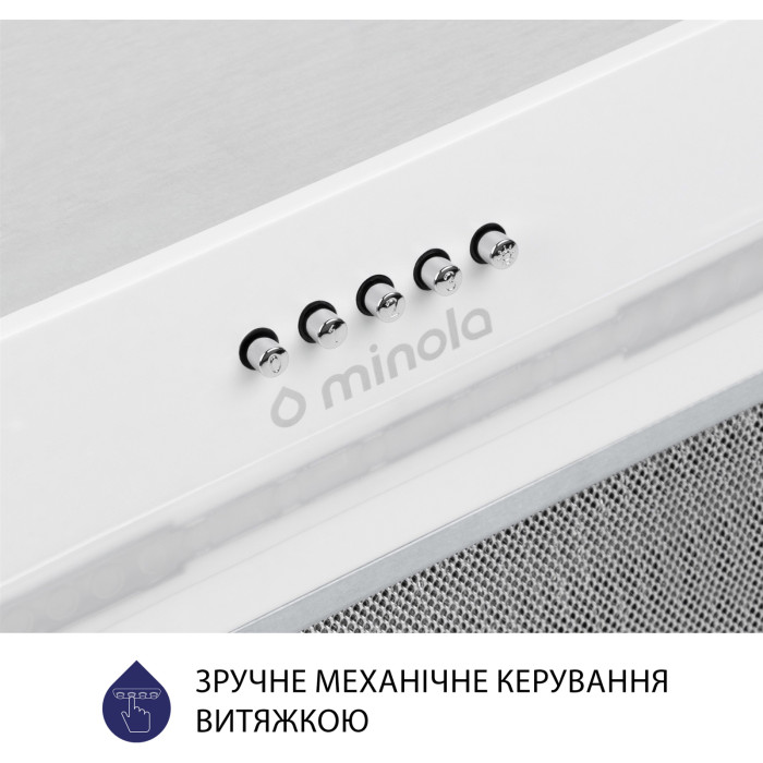 Завдяки чудовим ергономічним якостям, якими наділена модель Minola HBI 5223 WH 700 LED, вона підійде як маленькій, так і стандартній кухні. Частина конструкції пристрою, яка має бути прихована від очей, повністю ховається у шафі, а робоча частина залишається на виду та органічно доповнює загальний дизайн. Відкрита частина витяжки виготовлена із фарбованого металу білого кольору. Цей матеріал, крім візуальної привабливості, дуже легкий у догляді і має високу стійкість до зовнішніх впливів.