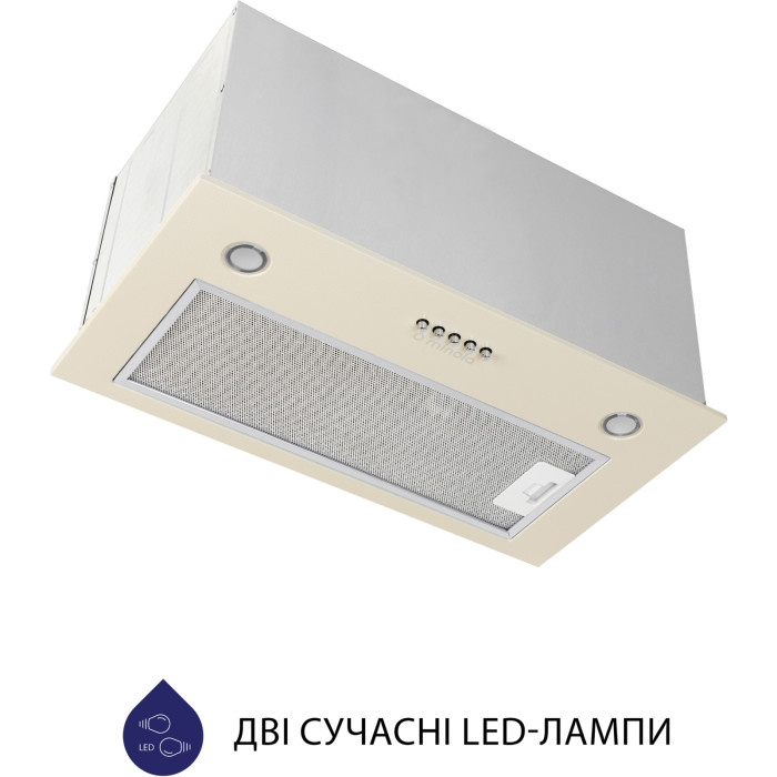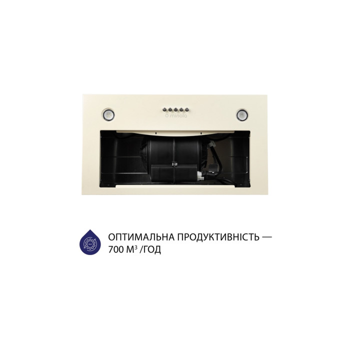 Завдяки чудовим ергономічним якостям, якими наділена модель Minola HBI 5627 IV 1000 LED, вона підійде як маленькій, так і стандартній кухні. Частина конструкції пристрою, яка має бути прихована від очей, повністю ховається у шафі, а робоча частина залишається на виду та органічно доповнює загальний дизайн. Відкрита частина витяжки виготовлена із фарбованого металу світла слонової кістки. Цей матеріал, крім візуальної привабливості, дуже легкий у догляді і має високу стійкість до зовнішніх впливів.