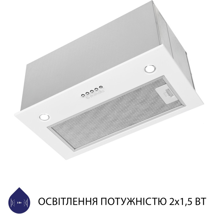 Повновбудовувана кухонна витяжка Minola HBI 5627 WH 1000 LED обладнана двома круглими LED-лампами потужністю 1.5 Вт кожна. Світлодіодні лампи забезпечують комфортне додаткове освітлення вашої кухонної поверхні, залишаючись найбільш економічним джерелом світла.