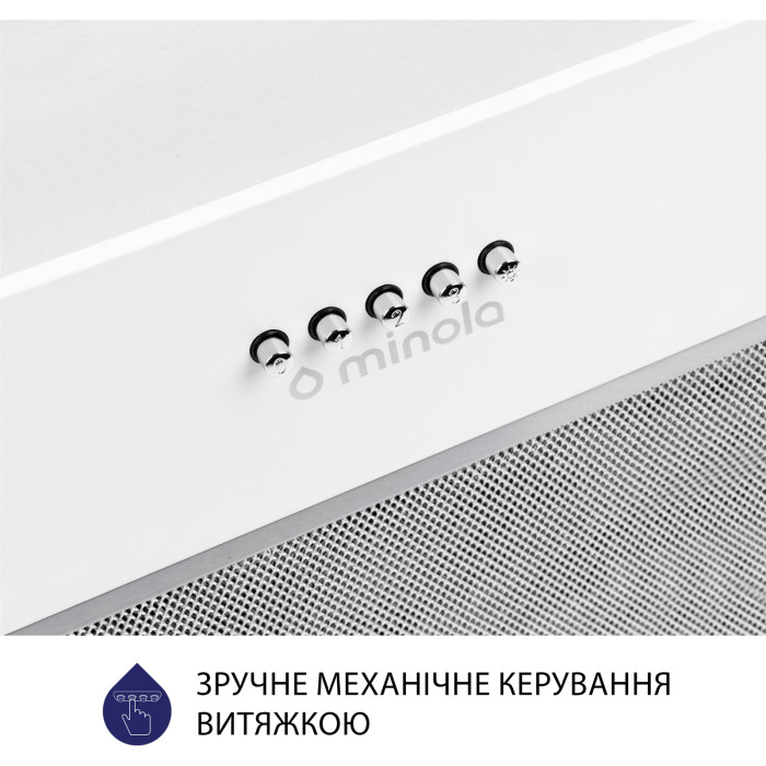 Кухонна витяжка Minola HBI 5827 WH 1200 LED обладнана тришаровим жировим алюмінієвим фільтром. Він забезпечує надійний та ефективний захист двигуна та інших деталей витяжки від потрапляння жиру та бруду.