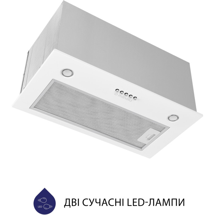 Повновбудовувана кухонна витяжка Minola HBI 5827 WH 1200 LED обладнана двома круглими LED-лампами потужністю 1.5 Вт кожна. Світлодіодні лампи забезпечують комфортне додаткове освітлення вашої кухонної поверхні, залишаючись найбільш економічним джерелом світла.